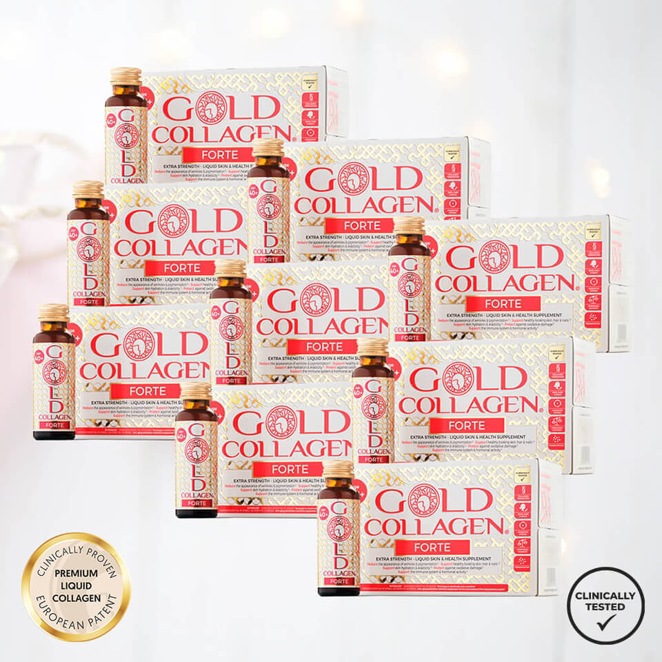 9 Gold Collagen FORTE geriamo kolageno dėžutės (pilnas 3 mėnesių kursas) už GERIAUSIĄ kainą! Gold Collagen FORTE yra populiariausias geriamas kolagenas. Jame esančios medžiagos padeda išlaikyti odos elastingumą, puikiai ją sudrėkiną, todėl oda tampa lygesnė, jau esamos raukšlės mažiau pastebimos. Taip pat šis geriamas kolagenas skirtas plaukams, nagams, gerina bendrą savijautą. Maža molekulinė masė užtikrina greitą ir lengvą veikliųjų medžiagų įsisąvinimą. Gold Collagen FORTE+40 yra vienas stipriausių Gold Collagen geriamo kolageno serijos produktų. Poveikis patvirtintas klinikiniais tyrimais. Itin malonaus skonio.